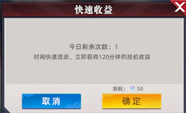 为了让玩家能更高效获取挂机物资,游戏还提供了快速收益功能。玩家可使用该功能,迅速获得120分钟的挂机物资收益。这在玩家急需资源提升角色,又没时间长时间等待挂机时,是个绝佳选择。