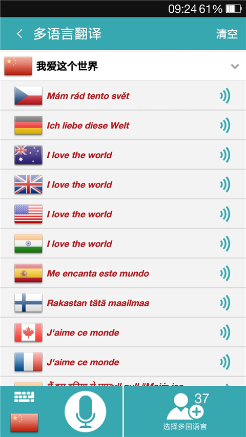 4、输入中文后,会出现多国语言的文字和语音翻译。