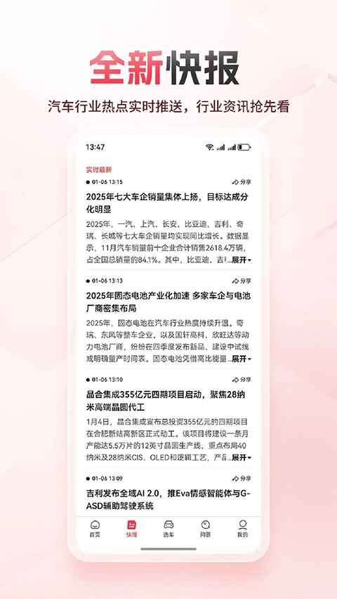 1.全新改版!快报 、资讯 、视频 、直播,汽车动态全掌握 2.焕新上线!选车、榜单、问答,买车决策不踩坑 3.[7*24]快报新增海报图片分享互动看车更尽兴 4.热门车型榜单实时更新,销量口碑排名一目了然 5.修复若干已知问题和体验优化~