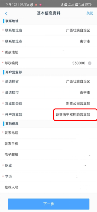 6、填写过程中,注意开户营业部,如不能修改开户营业部,请再选择“推荐人号”或者在该处输入营业部席位代码。