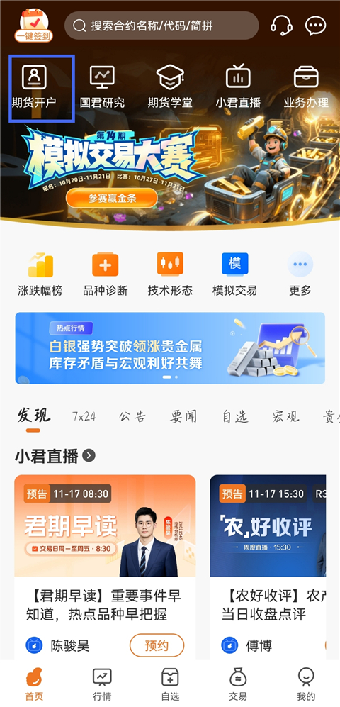 1、打开国泰君安期货APP,点击【期货开户】。