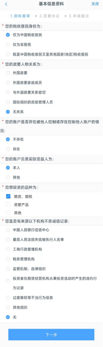 5、填写税收居民身份、投资品种等基本信息。