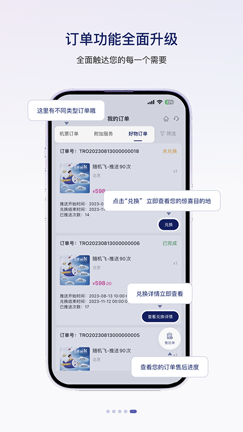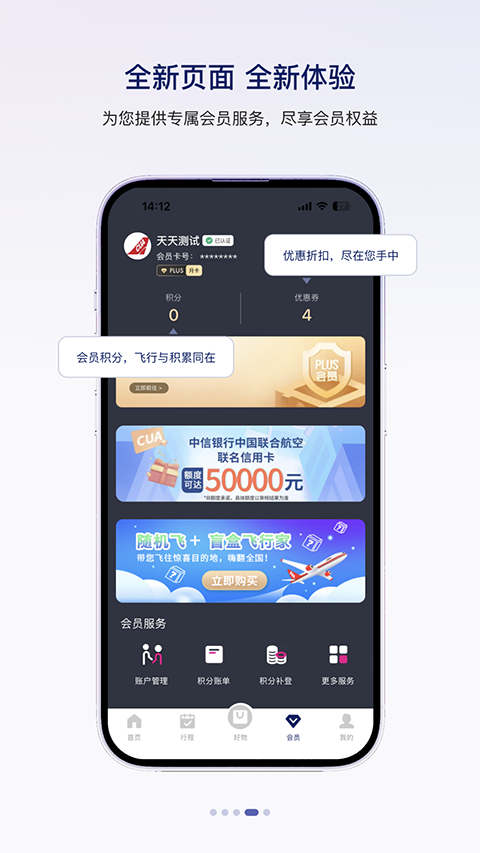 机票预订——快捷预订中国联合航空承运的单程、往返机票,支持在线购、退服务。 会员服务——支持中国联合航空会员注册登陆,实现订单管理、红包管理、乘机人管理等功能。 增值服务——可在机票预订页面、增值服务购买页面、订单管理页面三个通道实现您行程中行李、餐食等附加服务的选购。 选座值机——获赠中国联合航空座位选择的旅客,将同时享受在线值机的贴心服务。 不正常航班处理——提供不正常航班的线上处理服务。软件功能