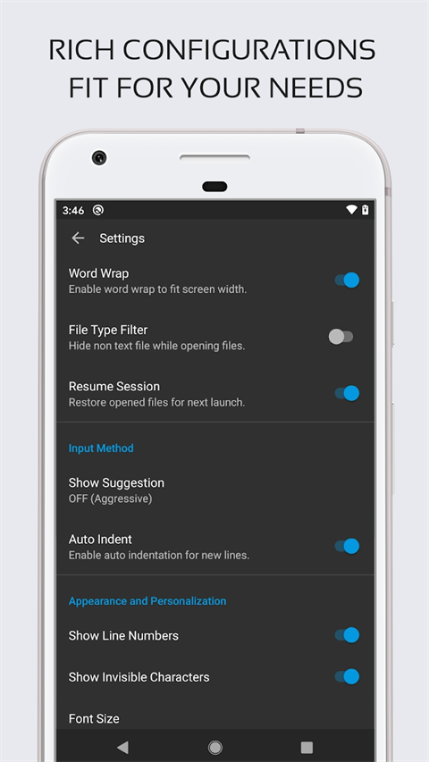 1、超过110种语言(c++、java、javascript、html、markdown、php、perl、python、lua、dart等)的语法高亮。 2、代码辅助、折叠和自动完成。 3、多标签间轻松浏览。 4、撤销和重做修改,无限制。 5、用正则表达式搜索和替换。 6、显示或隐藏行号。 7、高亮显示匹配的括号。 8、自动缩进和缩出。 9、显示不可见字符。 10、打开最近打开或添加的文件集的文件。 11、预览HTML和Markdown文件。 12、包含对Web开发的Emmet支持。 13、通过内置的JavaScript控制台评估JavaScript代码。 14、从FTP、FTPS、SFTP和WebDAV访问文件。 15、集成并轻松访问GitHub和GitLab。 16、访问来自 Google Drive、Dropbox 和 OneDrive 的文件。 17、支持物理键盘,包括按键组合。 18、3个应用主题和30多个语法高亮主题。更新日志
