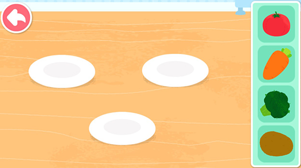 之后就可以让宝宝选择右边自己喜欢的蔬菜装盘啦!让宝宝点击右边内的蔬菜拖入盘中即可。