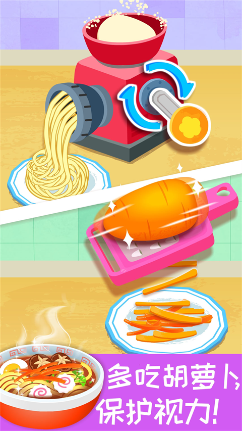 1、荤素搭配,均衡营养 DIY番茄三明治咯!把番茄切开、捣碎, 做成番茄酱。将番茄酱涂抹在吐司上,加鸡蛋、培根,再搭配彩椒,营养更均衡。Q弹的蔬菜肉丸,营养丰富,增强宝宝免疫力。 2、胡萝卜+鱼肉,眼睛更明亮 解冻鱼排,刷酱、加调料、裹面粉,炸至金黄,酥脆的鱼排完成。接着,将胡萝卜削皮、刨丝,烹饪护眼明目的胡萝卜面,加个爱心鸡蛋就更棒啦! 3、健康果蔬,补充膳食纤维 切西瓜、香蕉和梨,剥开葡萄、青菜,加上沙拉,轻轻搅拌,果蔬沙拉完成!水果能够改善肠道功能,促进宝宝的消化吸收。来碗水果燕麦奶昔,能够降火去燥哦。 4、创意美食,让宝宝胃口大开 切菠萝,挖果肉,将果肉和米饭蒸熟,装进菠萝“碗”,再挑选蘑菇、番茄点缀。色彩和营养丰富的菠萝饭,激发食欲,让宝宝养成不挑食的好习惯。宝宝营养料理游戏果蔬汤制作教程