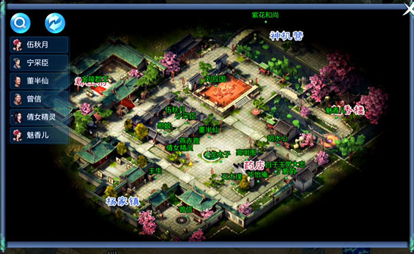 5、组队后却发现队友不在身边?点击屏幕右上角打开当前场景地图,即可查看队友和怪物分别在何处。左上角的放大镜图标是查询按钮,用它可以快速寻找重要的NPC。点击切换按钮则会切换到世界大地图,在非战斗情况下,可以快速传送到指定场景地图。