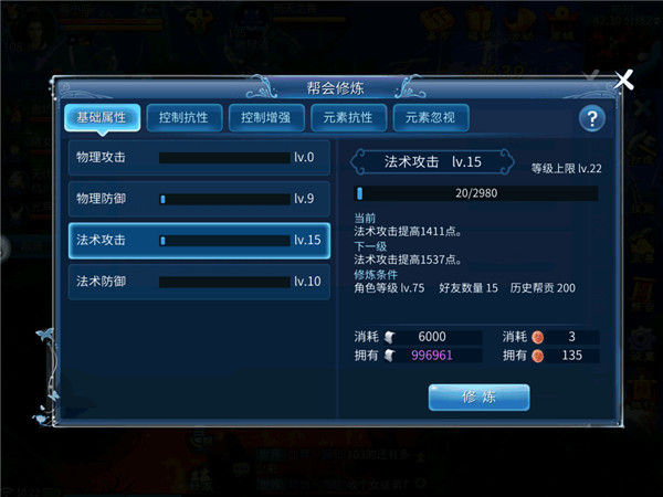 修炼的选择还是根据个人的需求,比如小喵的职业是方士,所以我先点15级的攻击,10级的双防。其他的点2级(因为要的帮贡少)主要点忽视电抗跟火抗。