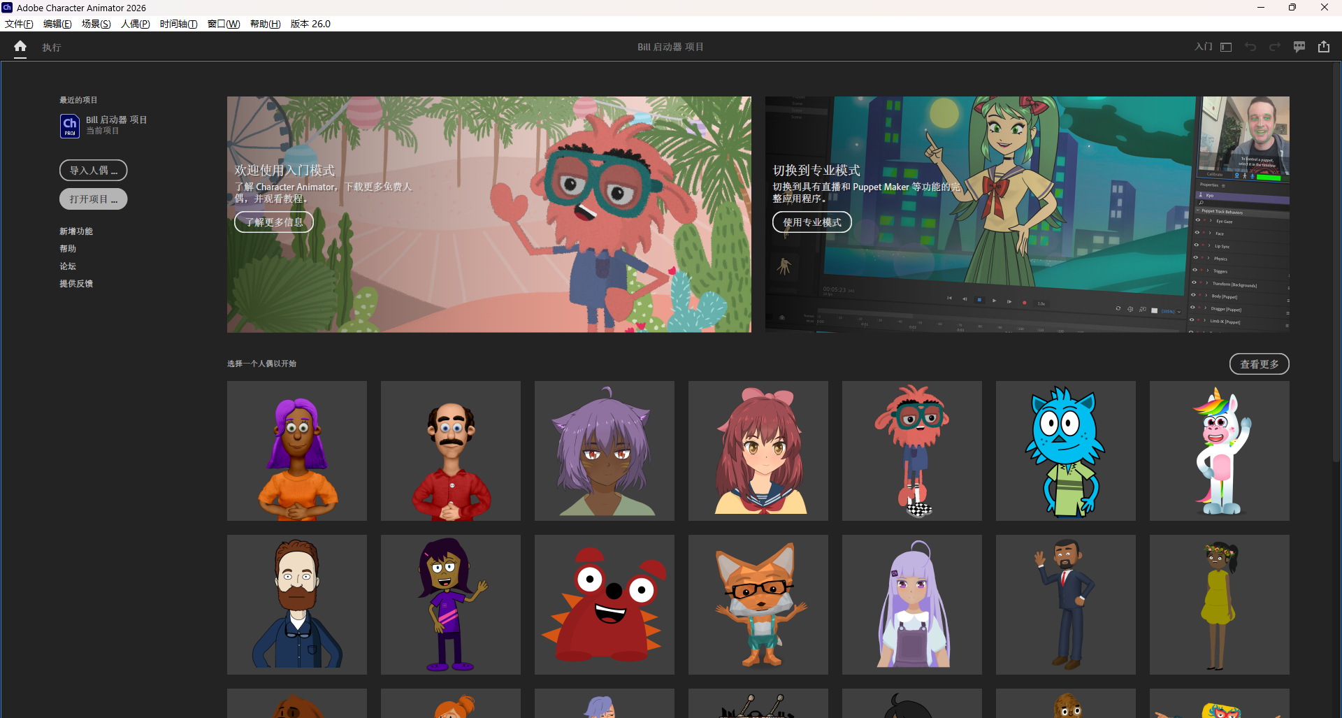 9、运行Character Animator 2026,此时用户可免费使用。