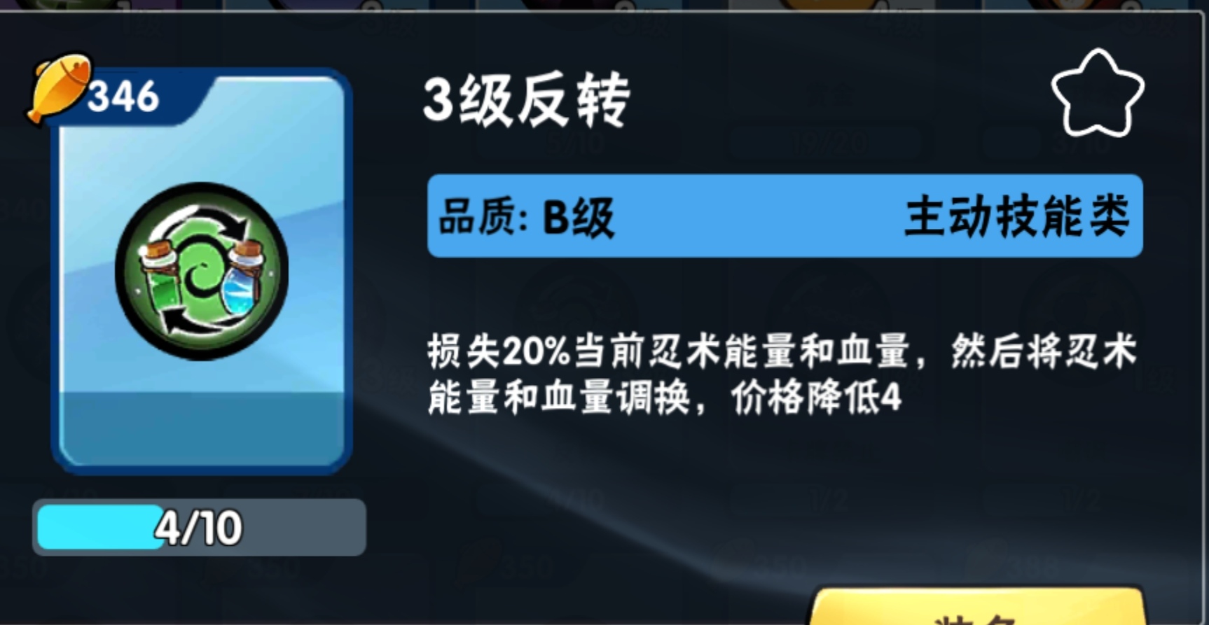 反转是一张蓝色品质的牌,价格350,效果是同时损失20%的生命与忍术能量,并将其交换,好理解一点,就是你满血你忍术能量是零,那这种情况下,你使用这张牌,那么得到的效果是生命值变成一(不致死),而忍术能量变成80% 反转这张牌,我平时比较喜欢带我推荐是普通地图,可以带,再镜像地图也可以带,他能快速使出二大,但是,我不推荐他在普通精锐图,正常情况下的话,除非队友真的带不动,否则,开二大的机会真的没有,这边更推荐高端图的镜像地图和普通地图,这个卡牌的话,可以快速使出二大,配合技能以及一赛季的那个武器,可以快速攒满100点,但不过,你一定要保证你的血量健康,否则换回去的话,真的很惨,而且他在死穴图也可以用,你可以在跑图的时候能量100,但是你的生命值不多,直接用交换,这种情况下也能获得80%的生命,所以还是挺值的 普通地图推荐指数:6 高端地图推荐指数:8 镜像图推荐指数:7 11、诅咒盾