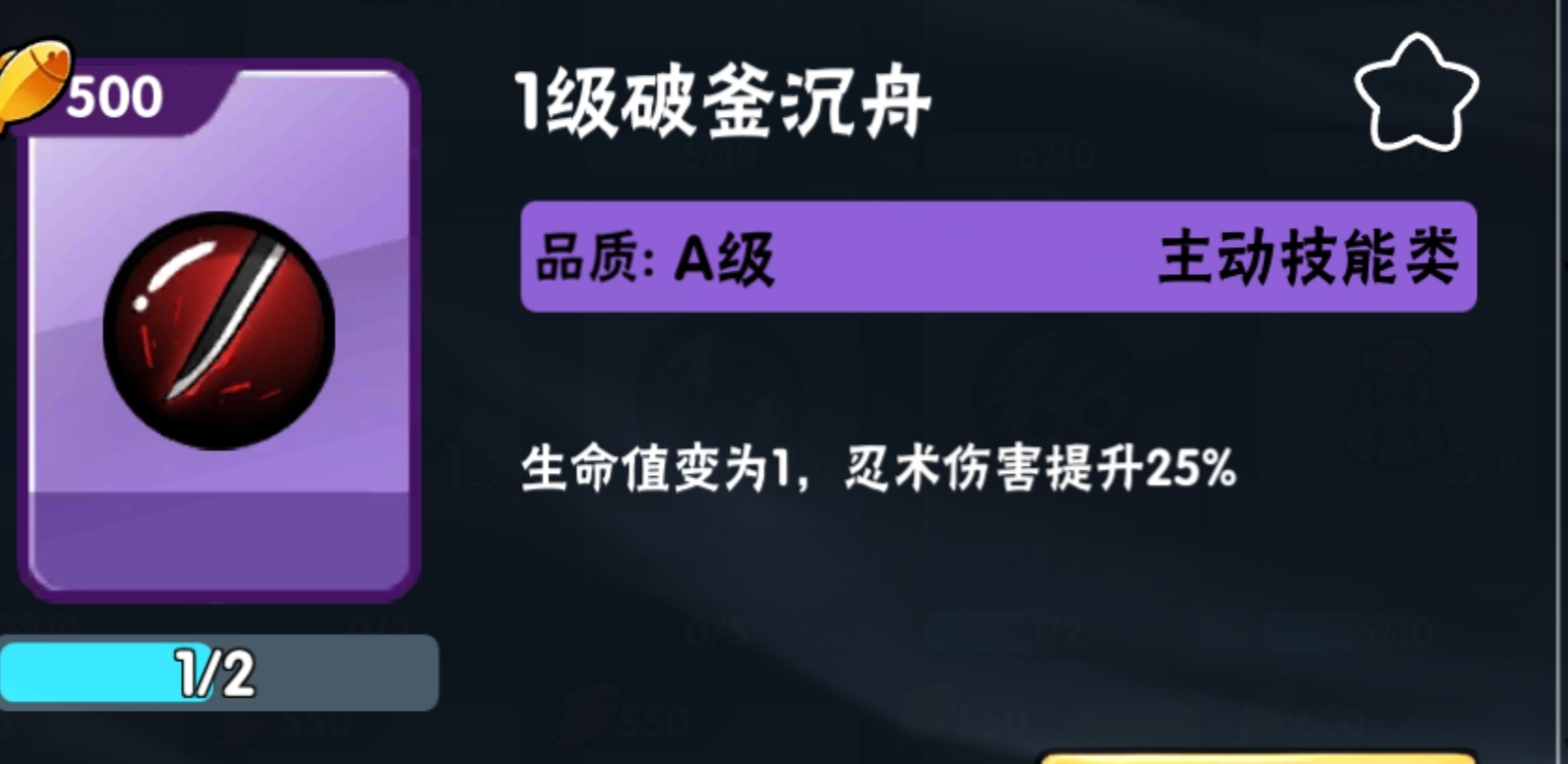 破釜沉舟也是一张紫色品质的牌,它的效果是把生命值永久变为一,忍术伤害提升25% 破釜沉舟的话,我更推荐即死图原因是因为他与背水一战一样,也是将生命值变为一,但是会提升伤害,只不过背水一战是提升武器伤害,而破釜沉舟是提升忍术伤害,在作用来看,我认为是忍术伤害的提升可能会大于武器伤害,毕竟一个人数能抵好几个武器了,而且一般高端图开个三个大也没问题,所以我推荐就是即死图这两个都可以带 普通地图推荐指数:4 即死图推荐指数:8 3、两败俱伤