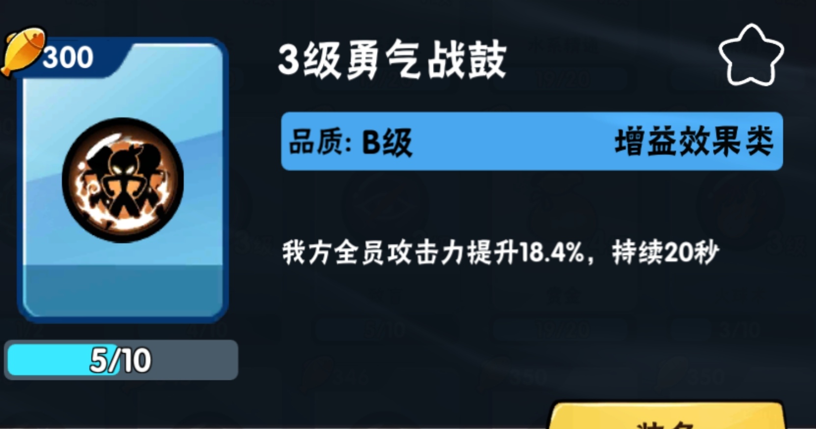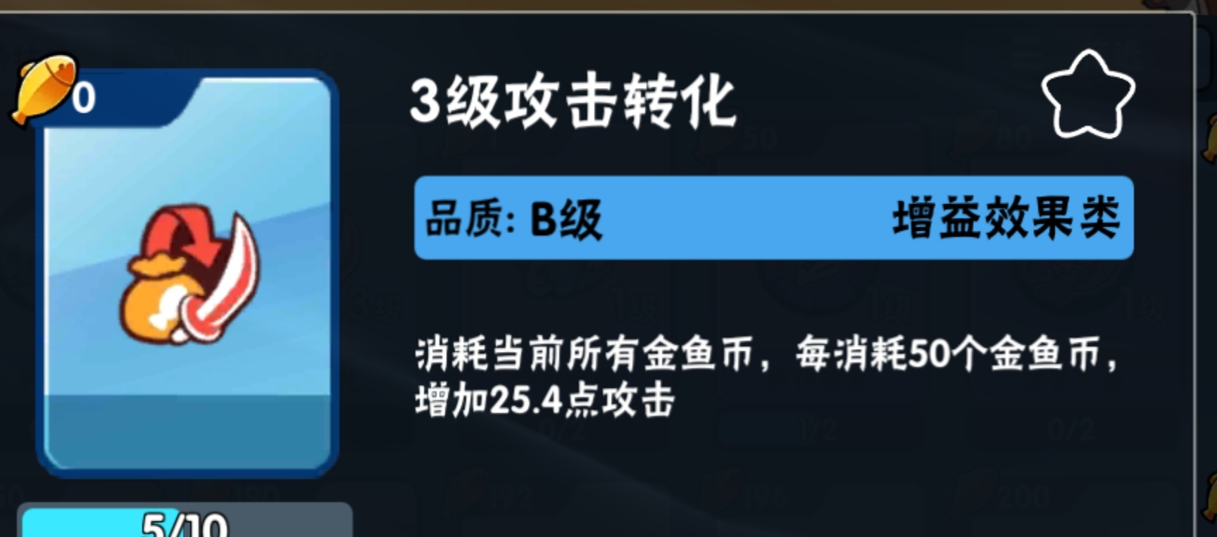 攻击转换是一张蓝色品质的牌,它的效果是消耗你的所有金鱼币,金鱼币每到50,那你的攻击力增加增加25(这个我不知道,他没到50,是不是按50算的) 攻击转换的话,可以作为一张全图通用的牌,他的效果的话,其实没有很差,但是,在金鱼币富足的情况下可能你买个高级强力还比他有用,毕竟他是50金币才能换个25点攻击一个高级强力好像300左右,那他要想打到高级强力的这种效果我就以370来算那他就要750个币才能达到370(这里370是因为我的高级强力升过级)所以可能说除了特殊情况下,攻击转换不建议携带,,毕竟有这个钱带攻击转换,还不如带高级强力 PS:我感觉到时候肯定有人会说,我攻击转换是为了消耗多余的金鱼币,但是我想说,我一个精锐图,我总价值都特别高了,1300+但依旧能买光,所以攻击转换不如带一个高级强力,可能说偷窃图比较适合,有可能吧。 普通地图推荐指数:2 8、勇气战鼓