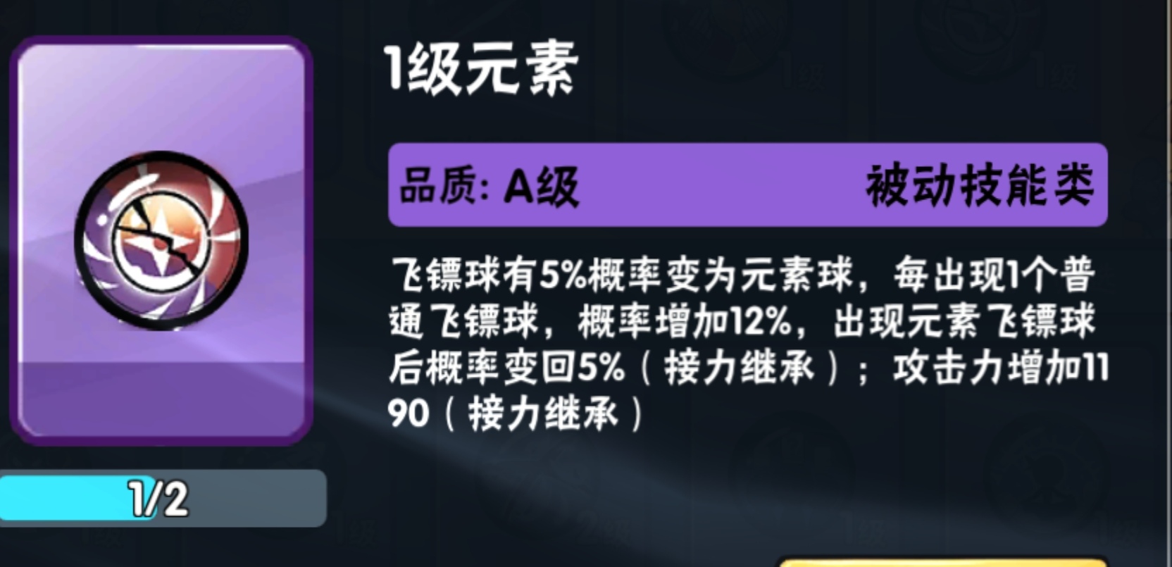 效果是有5%的概率,将普通飞镖球替换成元素飞镖球,每出现一个普通飞镖球,就会增加12%的概率,分别会出现火,冰,风,雷元素球 这张牌的话,效果肯定不差,他为飞镖球带来的功绩也是挺好的了,要比一般飞镖球高个挺多,但是同属性效果不叠加,不过,不同属性的效果可以叠加,火元素球就是火球,冰原诉求就是冰晶,风元素球就是风刃,不过,雷元素球有点变化,是五个可以自动追踪敌人的环绕型飞镖,可以飞出去两次,两次后消失,这张牌的话,我推荐是全图通用,都可以携带 普通地图推荐携带指数:6 19、雷悟