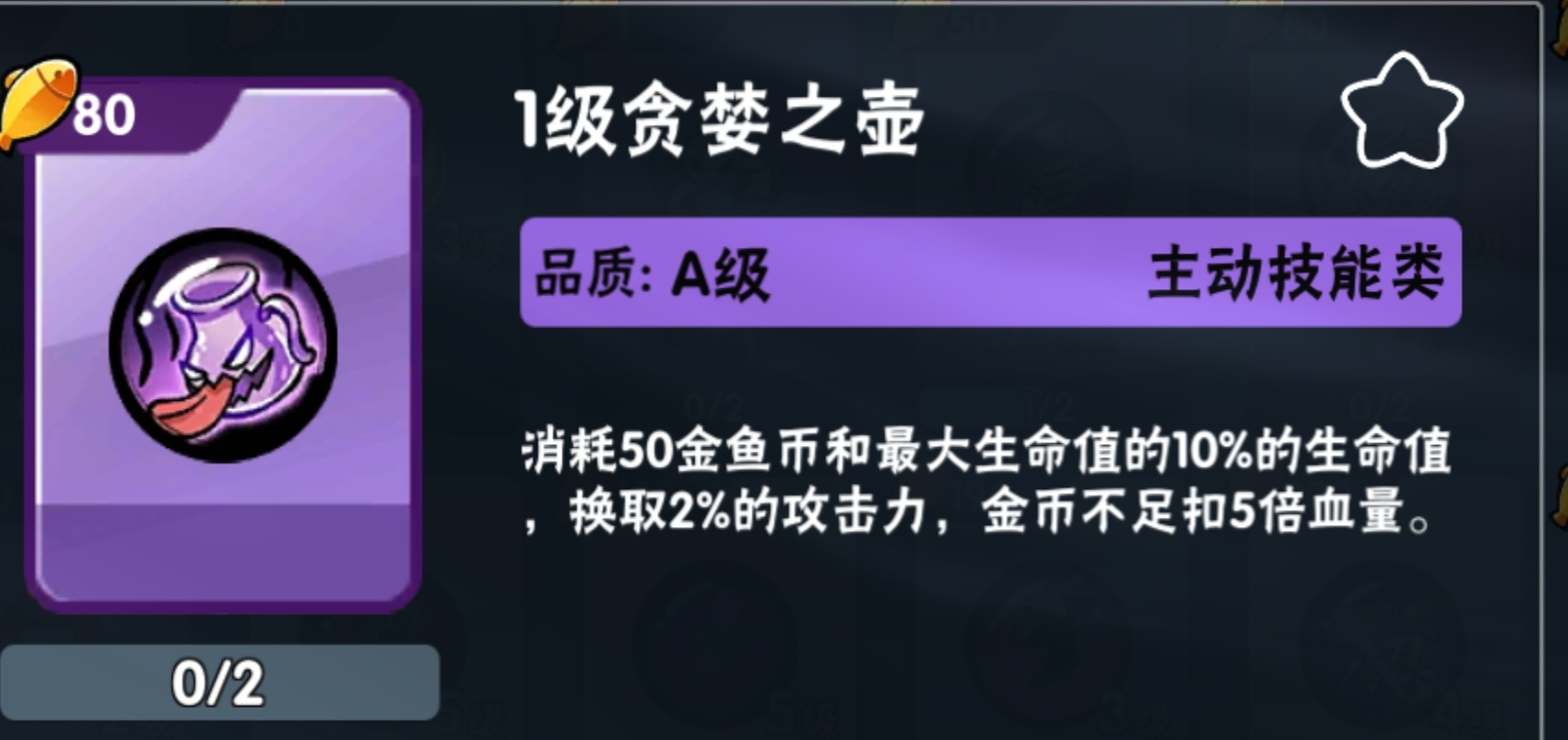 贪婪之壶是紫色品质的牌,属于可重复利用卡牌,消耗80金币币购买,效果是使用贪婪之壶,将消耗50金鱼币和最大生命值的10%换取2%的攻击力,如果金鱼币不足,将扣除五倍血量 贪婪之壶的话,我正常都没见有多少人用它,贪婪之壶带来的加成,可以说是微乎其微,特别是对新手而言,我就以4000攻击力来算,那用这个贪婪之壶,也就只有80的攻击力,所以呀,从这里可见,这个最大的作用可能用于献祭吧,毕竟快速献祭你值得拥有,我这边是不推荐怎么上场,因为作用实在太差 普通地图推荐携带指数:2 13、卡牌禁止