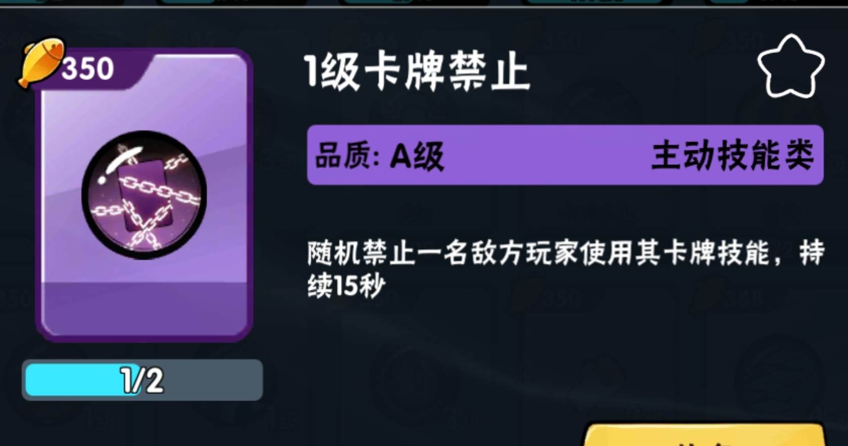 卡牌禁止是一张紫色品质的牌,消耗350金鱼币购买,效果是在一定时间内封锁敌方的所有卡牌,不封锁被动 卡牌禁止可能低端局带的人也不多但高端局也没见几个人带上,虽然说她有着封锁卡牌的效果,面对于对方只有一人,并且死了两个队友来说还是挺好的,只不过,正常情况下是没有样子夸张,除非特别特殊,否则真的不会说开局死两队友,就剩下一个人,然后这种情况下,你给一个卡牌封锁那对面卡牌也用不了,阻止对方的最大输出,毕竟这十几秒打的输出也是不少的了,这双排的话,我是表示,正常情况下,非必要情况下不必携带,在1v1的场景下,可以带上 普通地图推荐指数:3 1v1推荐指数:5 14、群体虚弱