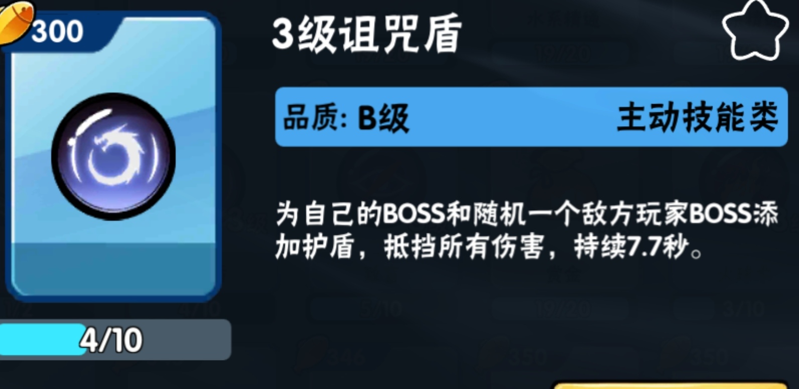 诅咒盾属于蓝色品质的一张牌,消费300金鱼币获得,效果是释放的时候,为自己和对方任意一名玩家添加诅咒盾,抵挡任何伤害,持续应该是七秒,不升级来算 诅咒盾这张牌吧,比较坑,低端局我比较少看到,因为他价格不如买群体诅咒盾,效果也不如群体诅咒盾,除非对面只有一人,否则这张牌的话,我感觉正常情况下用到的情况不多,诅咒盾的话,可以作为全图通用的,诅咒盾的话,最主要是你一不想让对方获得伤害,但是以你和对方几乎同时抵达的速度来算,那你限制他伤害也等于限制了你的伤害,所以这叫伤敌1000,自损800,你在封锁了敌人的攻击的情况下而你又被封锁了,所以两败俱伤,我感觉没必要,不如带其他,但是分一个特殊情况,就是说你后面到的,那你直接买就可以直接用了,这种情况下,不妨碍,但是双方同时到的情况下来说,整体效果还是比较鸡肋的了 PS:以前诅咒盾和群体诅咒盾都不对自己施加盾,所以改了之后还是挺鸡肋的,所以现在我认为不推荐带这个 普通地图推荐指数:5 1v1推荐指数:4 12、贪婪之壶