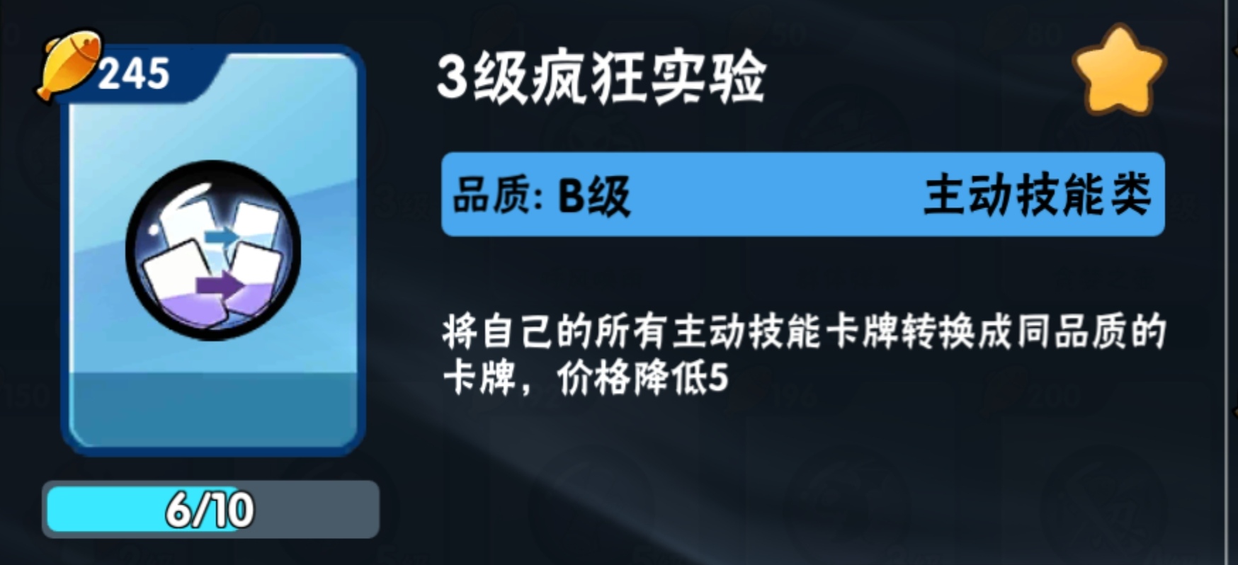 疯狂实验是一张蓝色品质的牌,原价格在250,整体作用是将你手中的卡牌替换成相同品质的卡牌 疯狂实验这张牌的话,出场率比较低,因为整体的话,对地图要求很高,必须得是那种卡牌多,而且你自己带的卡牌也多的那种,要玩疯狂实验的话,我更推荐就是带上群体弹幕,贪婪之壶,这种比较低价格的牌,换成其他相同品质也不错,疯狂实验的话,我这边是推荐多卡牌地图,且自身最好携带厨疯狂实验以外的高品质牌 普通地图推荐指数:4 多卡牌地图推荐指数:6 10、反转