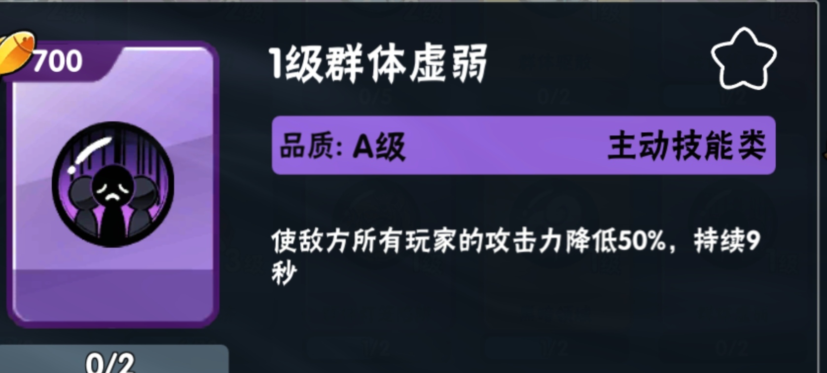 群体虚弱是一张紫色品质的牌,价格700金鱼币,释放后降低敌方所有人攻击力50%,持续九秒 群体虚弱的话,在高端局可以携带,毕竟50%不是一个小数了,我这边推荐是普通地图,推荐携带,高端地图推荐带上,这张牌可以有效的抑制敌方输出,对于那种短时间高爆发的角色是最佳克星,毕竟整体伤害砍了一半,你说能不难受吗?正常情况下的话,如果是打的精锐图以上就可以带了,毕竟这情况下都不是脆皮,脆皮boss不要携带 普通地图推荐携带指数:7 15、 黑暗领域