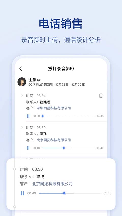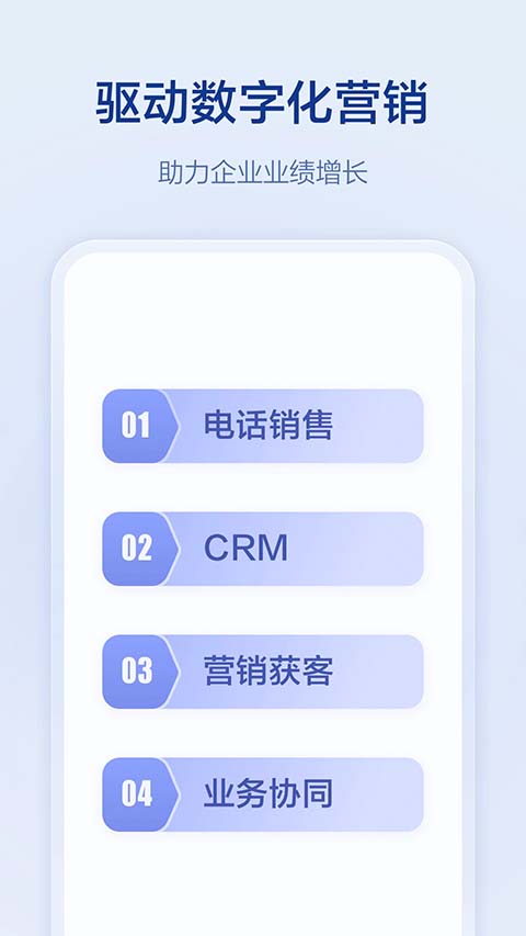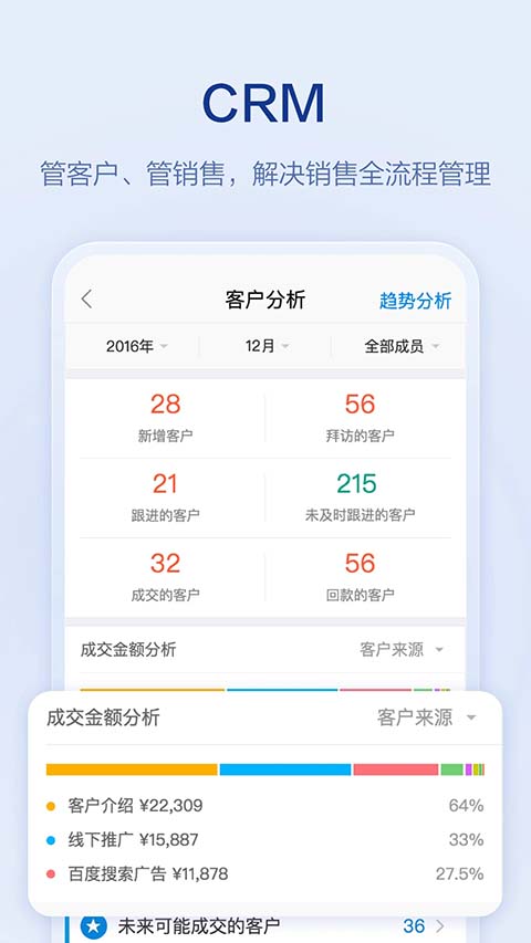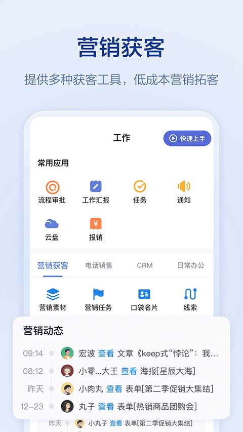 1、营销拓客 满足企业多渠道获客、线索统一管理,同时提供丰富的获客素材、获客手段触达客户,强化社交获客能力,推动客户转化。 2、智能CRM 客户管理、销售流程管理(商机、订单、商品、合同、回款)、成交管理、营销推广等,搭配强大的数据分析报表,帮助企业更简单的掌控公司业绩和管理客户。 3、电话销售管理 一键拨号、电话录音、电话数据统计、云电话、电话排行榜等,让CRM与电话机完美结合,帮助企业掌握员工通话数据,优化沟通话术,提升销售业绩。 4、移动考勤 手机考勤、排班打卡、外出拜访签到、定位打卡、外勤轨迹等,解决员工外出考勤困扰,提高外勤管理效率。 5、进销存 涵盖采购管理(采购订单、供应商、采购报表)、库存管理(入库单、出库单、库存调拨单、库存盘点、库存查询、库存报表)、销售管理(商品、客户、销售订单、回款)、每一个关键节点,帮助企业全面、高效管理进销存业务。 6、OA办公 流程审批、工作汇报、视频会议、移动报销、任务管理、企业云盘、在线聊天等丰富的功能。软件特色
