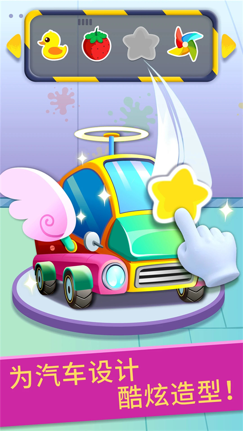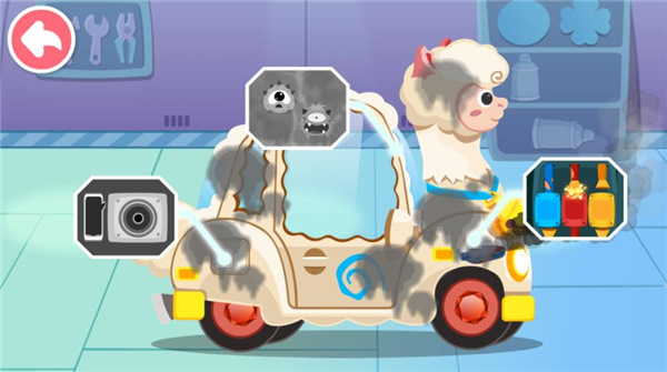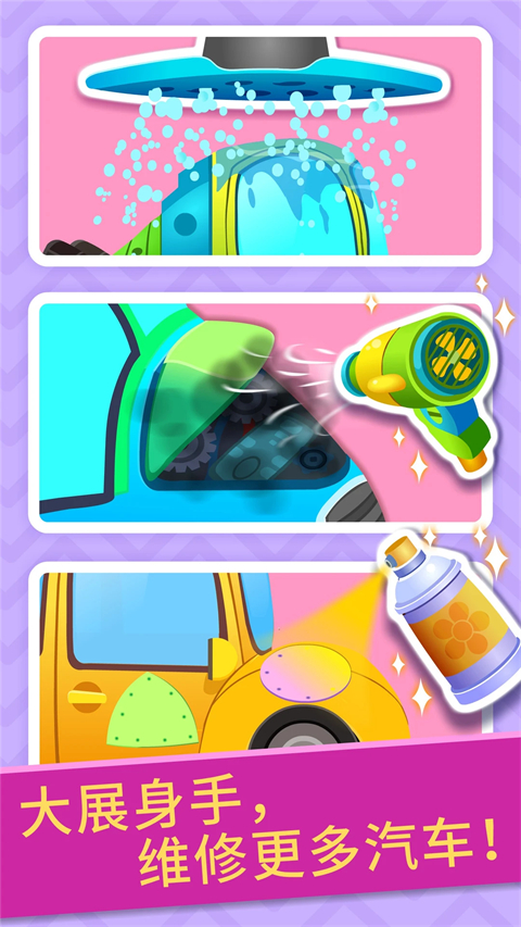 1、扫描汽车故障 修车店新增扫描项目,宝宝快来试试吧!先移动扫描仪,扫描火箭车。看!火箭车的问题是爆胎和引擎故障。又有一辆汽车来维修啦,宝宝快拿起扫描仪,给汽车做个全面扫描。 2、动手修理汽车 扫描完汽车故障,开始维修!打开汽车引擎盖,连接好相同颜色电线,添加机油、玻璃水等,在修理中进一步了解汽车内部构造。天使车爆胎了,该怎么修理呢?宝宝来大展身手吧。 3、做好清洁工作 打开高压水管,瞄准污渍,发射强力水柱,耶!污渍被冲走了,接着移动花洒,冲洗干净车身。擦亮车窗,清理空调灰尘,车内、车外都要清洁,汽车变得亮闪闪! 4、提升汽车时尚感 为汽车设计造型吧!先装饰内部:金色铃铛挂坠、七彩坐垫,创意饰品,把车内装扮得美美哒!接着设计车身,挑选恐龙、火箭造型的贴纸,粘贴在车身,瞬间提升汽车时尚感。宝宝修车店游戏新手指南
