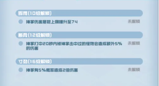 潜能3(寸劲—16级解锁)∶神掌有5%的概率造成2倍伤害。