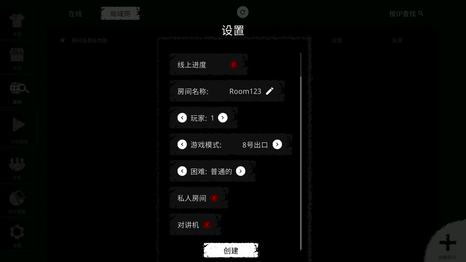 3、输入好房间名称,选择玩家人数,玩家人数最多是五人。游戏模式逃脱、8号出口和生存模式。然后再选择是否开启私人房间和对讲机。全部设置完毕后点击下方的车【创建】。