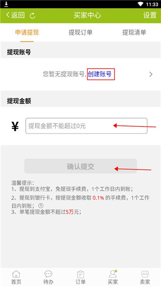 4、进入页面后,要是已有账号就可以直接输入提现金额提现,要是没有就要先创建一个收款账号。