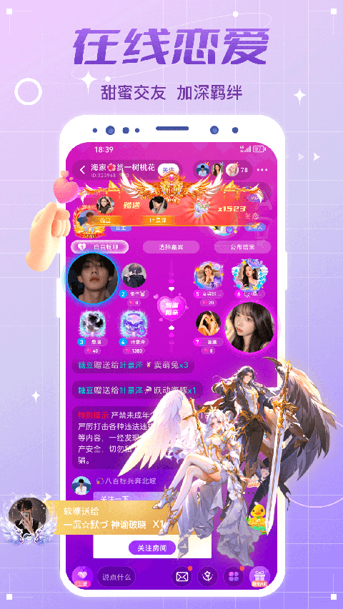 【在线表白】奢华、皇家表白,小手一挥,百万喜糖红包千万人见证围观祝福,成双成对恩爱满满 【兴趣群组】多种PK演绎虚拟江湖游戏人生,媲美我的世界 【师徒情谊】百般讨好,只为收你入门 【万人群聊】万人实时在线大厅群聊,抢红包,玩答题,美轮美奂逗乐嗨翻更新日志