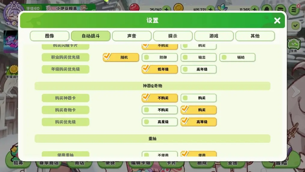 嘟嘟脸实战指南:从优化设置到精通核心战斗 一、优化游戏体验:必知设置详解 1、自动化设置:解放双手,专注策略 自动战斗设置 使徒设置:不购买闪耀卡片(容易血压升高),职业可随机,优先购买低年级(均衡发展;高年级则优先大招,看命)。 神器和奇物:神器关闭,随机给(血压↑);奇物开启,全队buff;优先购买高等级(金色-紫色-蓝色-绿色) 重抽自动刷新:自己抉择,开关各有优劣。关闭,刷到3神器时,容易跳过,直接开打,存在暴毙风险,但是可以吃利息;开启,每回合钱币花光,存在连续自动刷新,浪费钱的风险。 战斗剧情跳过:开启,重复刷图时开启可大幅节省时间。
