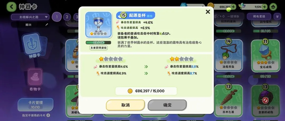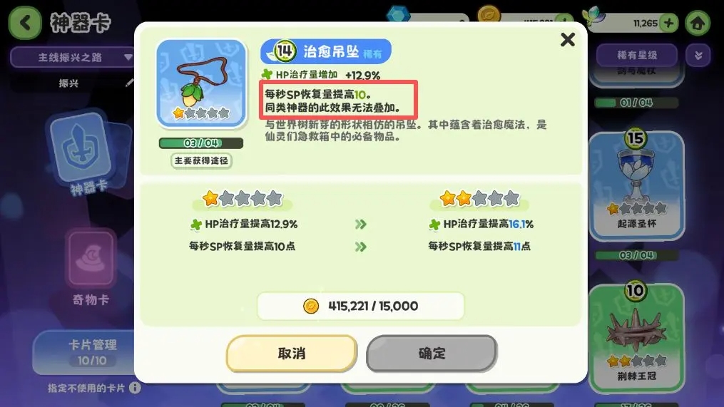 配置上限:您最少可携带 20张神器卡 与 15张奇物卡 进入某个模式的备选池。