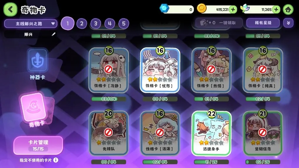 主线及其他常规战斗:根据您的主力队伍性格配置。目前开服主流为暗队(忧愁性格),因此,应携带 【忧愁】性格卡,并禁用所有其他种族性格卡(冷静、热情、纯真、活泼),以稳定提升忧愁羁绊等级,获得大量属性加成。