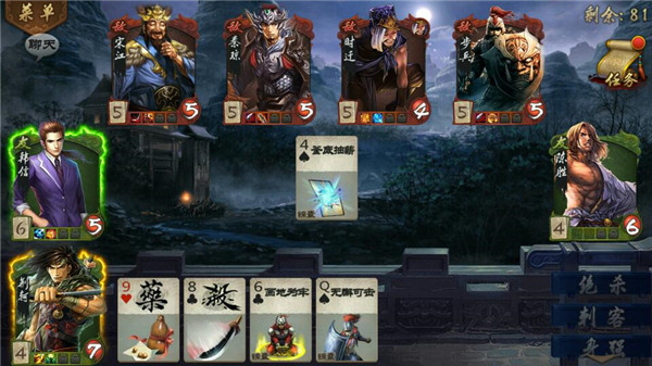 打出一张杀,如果对方没有闪,则要扣一点血。由于能够杀伤血量的锦囊只有7张,故而杀是游戏中最为常见也最为有效的杀伤方式。同时,杀还可以防御烽火狼烟和决斗,所以这是一张攻守兼备的牌。于是我们在使用杀的时候,就要考虑了,这张杀打出后,会不会造成我的防御力下降?由于烽火狼烟只有3张,所以我们可以记下场上已经放过的火的数量;如果之前一个都没有出现过,那么接下来手里没有杀的话就非常危险了,此时出杀便要慎重。杀既可以防决斗也可以防火,在这一点上也存在值得斟酌的问题。如果有人找你决斗,那么可以选择不出杀扣血,用杀来抵御接下来的烽火。如果自己装备有关键的武器,这时候也要注意手里留一张杀防止借刀杀人。如果有余力可以记住借刀杀人数量,为2张。记牌水平比较好的话,发现2张借刀和3张烽火都已经打出,这时候就可以毫无顾忌的出杀了。所有牌共108张,杀虽然多,也只有30张。一般的角色每回合的摸杀期望是不到1的。所以有的时候碰上烽火和决斗宁可掉血也不出杀,而是保留用作下一回合的输出~