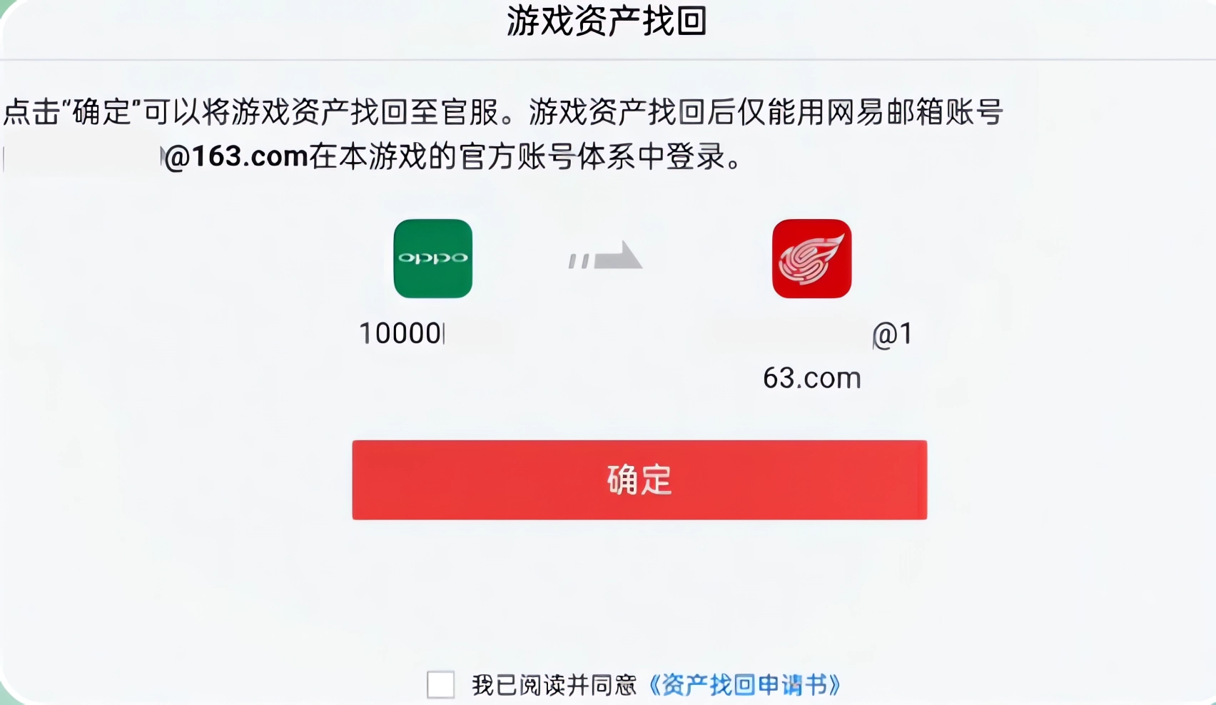 4、输入并登录网易账号后,确认资产找回角色ID与网易账号是否一致,确认无误后点击【确定】按钮。