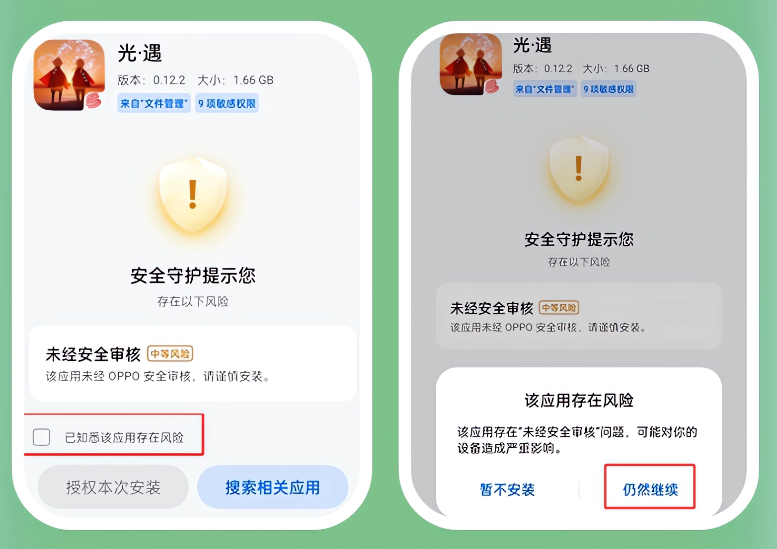 1、不要开启安全守护,提示未经过安全检测,勾选后仍然继续。