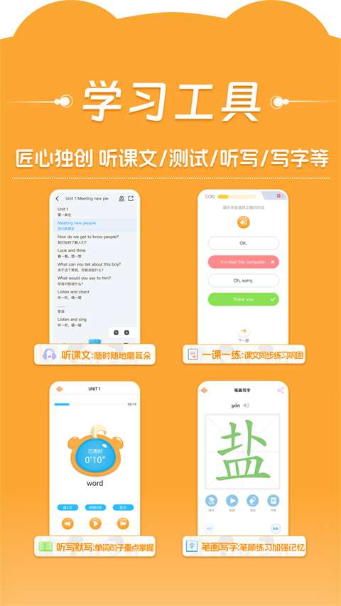 1、支持后台播放、待机播放 2、强大的复习功能,帮孩子巩固学习 3、提供听力、拼写、对话等8种测试类型 4、针对单词、对话的单元练习和期末总复习更新日志
