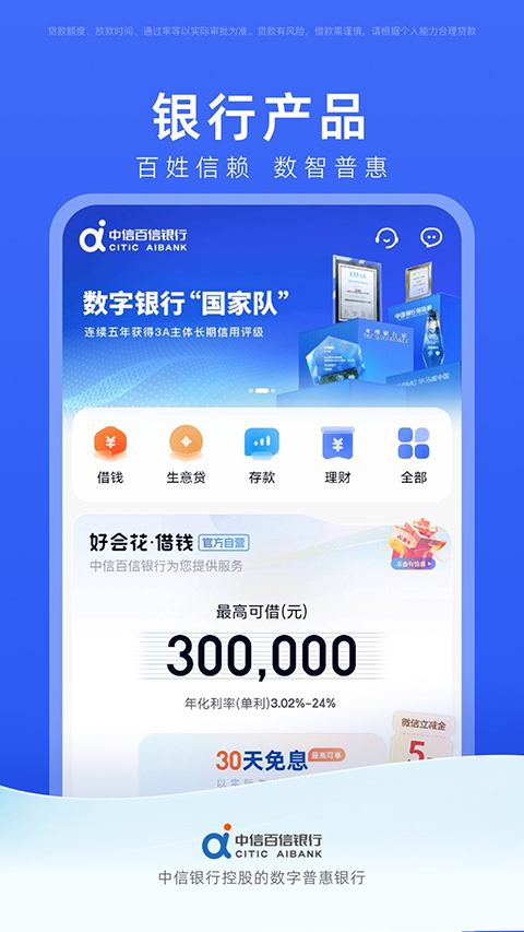 【中信控股】 2017年由中信银行和百度联合创投; 【稀缺存款】 各期限优质存款,最高年利率2.60%,存款保险,时刻守护; 【消费借款】 秒级授信,灵活借还,最高额度20万(以审批为准),日息低至0.02%; 【财富管理】 短期爆款、长期稳健,产品多样,助您财富增值; 【贴心服务】 7*24小时不间断陪伴,您需要的时候,我们一直都在;功能介绍