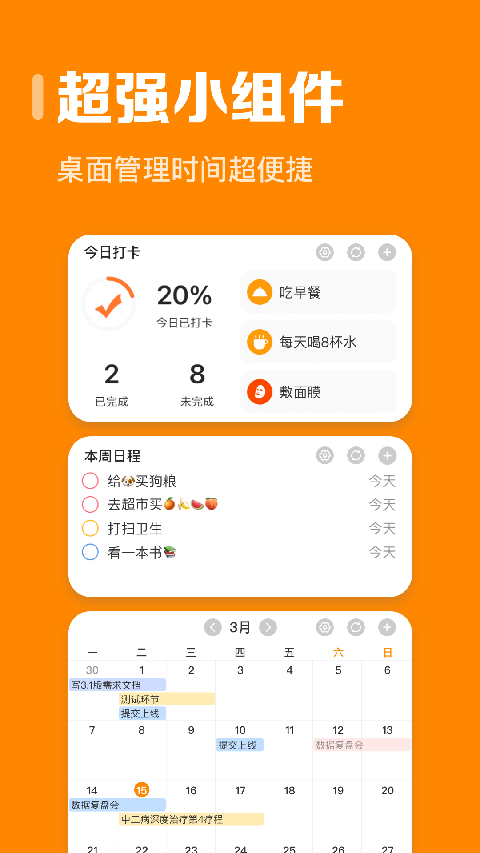 【日程】 记录日程清单,不再错过每件事 【倒记时】 恋人生日、还信用卡、发工资、宝宝出生,重要日期都在这里 【视图】 所有近期记事周视图、月视图,一目了然 【打卡】 立下目标,拆解进度,打卡实现梦想更容易 【番茄专注】 正计时倒计时番茄锁机,远离干扰,保持专注 【生日】 重要的日子,不再忘记 【笔记】 随时随地记录灵感,添加笔记 【云端存储】 数据实时同步云端服务器、再也不怕数据丢失 【主题换肤】 超多主题风格任你选,让你的APP更美观软件优势