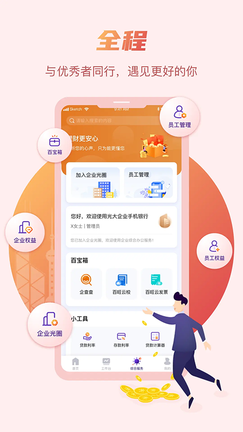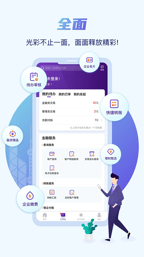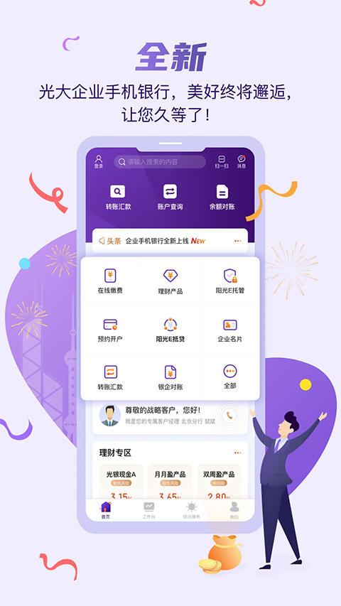 1、打造“B+C”新生态 通过打通双方用户体系,企业手机银行与个人手机银行可以联合登录,支持与企业网银操作员协同共用账户、权限、审核流程,一处设置即可同步使用。 对于企业客户而言,交易明细、账户余额查询、对账转账等都是常用高频功能,如果能够减少用户操作、快速完成功能选项则可以大大地提升用户体验。 2、融合金融与综合全量服务,精准滴灌小微企业 专门上线了为中小企业提供房屋抵押类贷款服务、便捷缴费服务的功能,并支持额度测算及线上授信申请,及时解决小微企业资金的“燃眉之急”。 3、发挥E-SBU协同优势,以综合金融服务赋能企业发展 充分发挥了E-SBU生态圈发展战略优势,集合银行、证券、保险等多家光大集团旗下机构特色,为企业用户提供光大银行企业账户开户预约、光大专业理财产品、光大证券账户开户预约、光大永明企业保险产品购买预约等服务。软件功能
