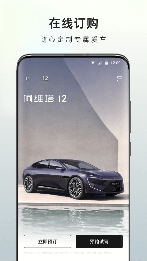 1、打开阿维塔汽车app,在车界面中点击立即预定。