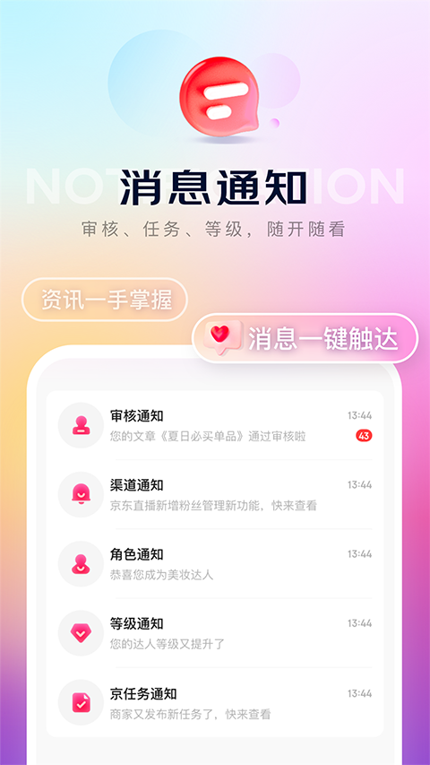 点击京东内容助手底部的消息Tab,进入消息列表,可查看官方推送的审核通知、渠道申请通知、角色认证通知,成长等级通知和京任务通知。