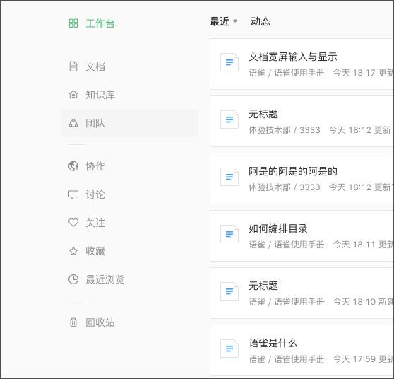通过工作台导航,可以快速查看最近参与编辑的全部文档,及所参与的所有知识库(不含企业空间)。在「协作」栏中,可以快速查看参与协作的文档