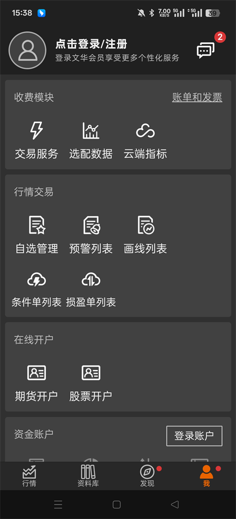 1、如何在随身行上查看国外交易所实时行情数据? 答:需要另外付费才能看到。 2、如何在随身行上选配付费数据? 答:首页->【我】->登录文华会员号->选配数据->收费行情数据授权。 3、如何使用付费账号登录随身行查看付费数据? 答:首页->【我】->登录文华会员号->选配数据->行情账号管理->登记录入已有授权账号。 4、如何使用随身行进行国内期货合约实盘交易? 答:通过随身行交易国内期货合约需缴纳软件服务费,60元/月、150元/季、450元/年,不限交易账号,不限交易手数,服务卡将与固定手机设备绑定,中间不可变更; 提示:使用随身行交易须确保文华会员服务是登录状态,否则无法交易。 5、使用随身行中的下单功能(进行国内期货实盘交易),如何付软件服务费? 答:首次购买需先登录文华会员服务进行实名认证,才可继续。 新购路径:首页->【我】->登录文华会员号->交易服务->充值实盘交易服务卡->支付。 续费路径:首页->【我】->登录文华会员号->交易服务,在服务卡列表中找到要续费的服务卡,点击“充值”。 6、什么是服务卡? 答:服务卡是针对每个手机设备使用的,每个手机设备只能有一张服务卡生效。如果要使用随身行交易模块必须拥有一张生效的服务卡绑定该手机设备。 7、如何绑定服务卡到相应手机设备? 答:首先确认是否有可被使用的服务卡,如果没有可在需要绑定服务卡的手机上直接购买服务卡,购买后系统会自动绑定当前手机设备。 在要绑定服务卡的手机设备上打开首页->【我】->使用服务卡对应的文华会员号登录->交易服务,在服务卡列表中找到可使用的服务卡,点击“绑定本机”按钮,之后按提示操作完成绑定。更新日志