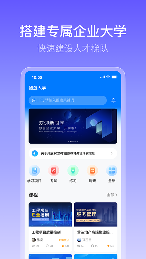1、【新员工培训】 自动化开展入职培训,覆盖率达100%,省时省力,实现员工快速上岗。 2、【微课制作】 内部员工、内训师三步制作微课,快速获取实战经验,人人皆可萃取知识。 3、【在线考试】 线上导入试卷、自动组卷、自动阅卷,培训成果可视化、过程数据实时统计。 4、【数据管理】 随时监测员工学习进度、考试学分,培训结果可视,为人事决策提供依据。酷学院APP官方最新版怎么登陆
