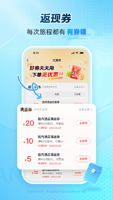 省心又省钱,新客专享7.6折订酒店最高立减300元 【里程赠送】新客立享2000里程,下单享更低价格 【省钱小技巧】先订票再订酒店立享专属折扣 【天天拼好价】邀请好友一起订酒店最高可领300 【选房助手】不知道怎么选酒店,选房助手给推荐 【截图比价】上传其他平台酒店截图,比出惊喜价 【商旅专区】出差党专属福利,订酒店享超多返现! 【超值红包】0.9元抢购60元畅游卡,用券更省钱 【业务上新】新增全国租车频道/推广大使赚佣金 【功能上新】新增行程添加日历/优化用户体验