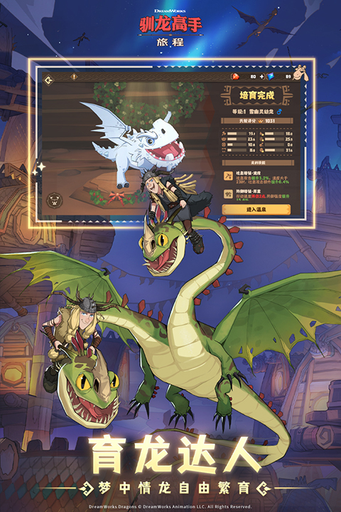 1、官方剧情,开启全新维京旅程 与小嗝嗝和他的伙伴们开启一场激动人心的冒险,探索未知的领域,迎来全新的维京旅程。 2、基建狂人,龙骑手重建博克岛 多种基建自由搭配,投身于博克岛的建设,为博克岛的居民和龙提供一个舒适和安全的家园。 3、龙之图鉴,龙群缤纷旅程相伴 在旅程中,你将遇见种类繁多的飞龙,与龙同行,用龙之图鉴记录下它们的特征和习性吧! 4、育龙达人,梦中情龙自由繁育 作为一名龙骑手,你将担负起繁育和培养龙的重任,通过照顾、喂养和训练龙,亲自培养它们的能力和品质,创造出属于自己的梦幻龙队!驯龙高手旅程手游玩法攻略