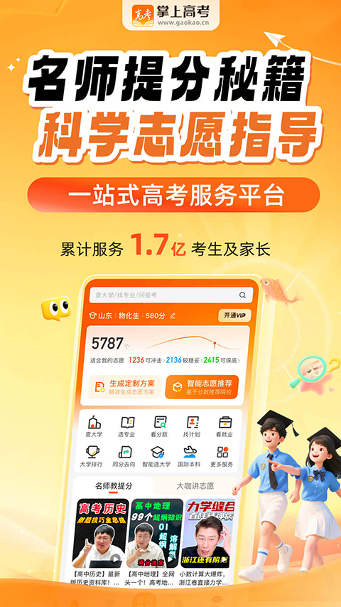 1、专业测评 科学认知 通过多维测试,为艺考、高考考生推荐出与性格及兴趣相匹配的专业方向,面对1500多个大学专业不再迷茫。 2、大学专业 深度解析 近百位知名教授深度解析高校热门专业,助力艺考、高考考生掌握专业内涵,知晓就业前景。 3、高校信息 免费查询 聚合2700余所高校信息,历年大学录取数据全面开放。 4、升学途径 全面掌握 重点高校、艺术院校招生负责人视频解读自主招生、艺考、单考等各类招生政策,给与艺考、高考考生升学指导!掌上高考app中的ai志愿使用方法