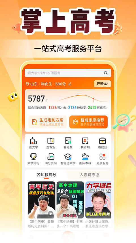 一、估分选大学 估分选大学是“掌上高考”团队开发的协助用户进行志愿填报选择的功能,用户通过输入必要信息和预估分数后即可得到系统综合往年各学校录取情况后推荐的建议填报大学。 二、学校查询 用户可在搜索框中输入想要查询的学校名称,然后点击搜索结果中正确的学校名称以打开页面,从而了解学校的概况、历年分数线、报考指南和专业设置等具体情况。同时,“查大学”还包含如下功能:大学排行榜、按地域查询、按专业查找、大学验证、985/211高校名单。 1、大学排行榜 大学排行榜是根据全国考生对于各大高校的关注热度提供的全国知名高校排名列表。 2、按地域查询 通过按地域查询功能,考生可根据选定的地域查看当地高校名单,从而根据地域来选择自己心仪的学校。 3、按专业查找 随着高考改革的深入,高考志愿填报将逐渐由“以学校为主导”变为“以专业为主导”。考生可结合自己将来想从事的职业,通过搜索相关专业名称,来了解目前已有哪些学校开设了该专业,从而进行学校选择。 4、大学验证 用户可通过查询大学的官方名称来确认该学校的真实性,从而辨别该学校的真伪,了解学校的具体属性。同时,用户可自主对没有办学资质的学校进行举办,经核实无误后会在资料库中进行修改。 5、985/211高校名单 用户通过查阅985/211高校名单可详细了解“985”“211”名词含义,并了解包含在名单中的所有高校。 三、专业查询 随着高考改革的逐渐深入和高等教育体系的逐渐完善,“以职业发展为方向”“以专业为导向”将成为未来高考志愿填报的主要方式。用户可结合自己未来的职业规划,通过查询相关专业名称来了解专业的具体介绍、相关学校等信息。同时,“查专业”还包含如下功能:专业热度榜、本科专业/专科专业。 1、专业热度榜 专业热度榜是结合用户对不同专业的关注程度从高到低进行排序的专业列表。用户可了解其他用户对不同专业的关注程度,并对自己的专业填报进行参考。 2、本科专业/专科专业 用户可根据自己意向报考学校类别分别查阅相关专业信息。 四、高考资讯 “高考百事通”资讯发布平台,集结全国各高校最新资讯、高考政策解读和备考指导等内容,用户可通过浏览最新资讯来决定备考方向和进行志愿填报准备。掌上高考ai智能填报助手app怎么填志愿?