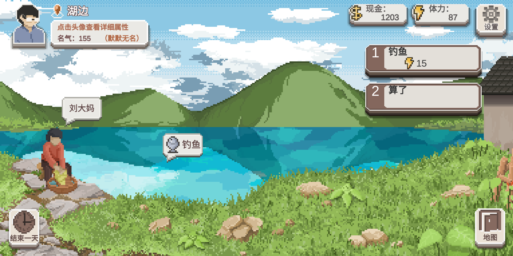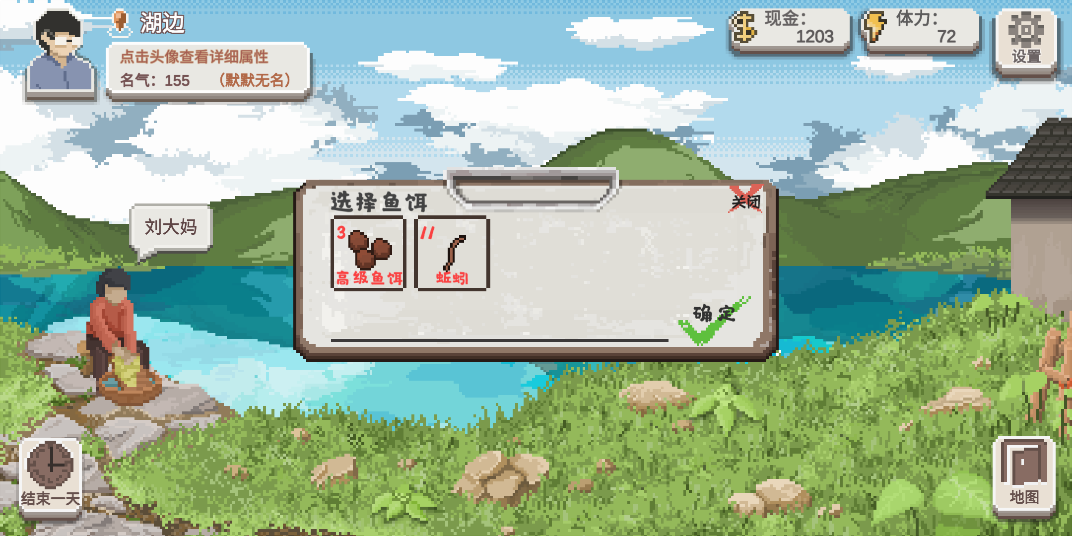 能抓多少抓多少,然后去找我们亲爱的老张大师,他是一位钓鱼大师,我们可以请教他(一次8体力,一天最多请教2次,几率白嫖一条鱼)来快速获得钓鱼经验,第一年不钓鱼,正常上课,疯狂刷他好感度和钓鱼经验,30好感度突进有钓鱼秘籍,正常的话,就再抓几只蚯蚓,然后去钓鱼。