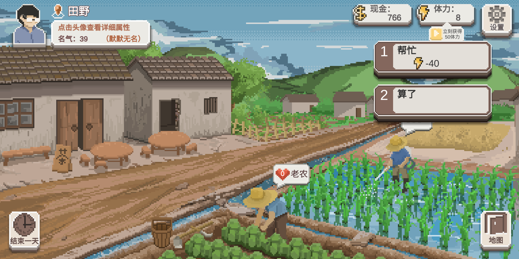 想要快速提升种植等级的话就去田地(地图)那边找老农和旁边的普通NPC,两个都可以请教,一天最多三次,一次+10种植经验,等于你浇10次水,并且可以根据委托,找到老农,帮忙收蔬菜,-40体力,可增加大量好感度,获得一些蔬菜,蔬菜可以拿去卖~或者拿去吃