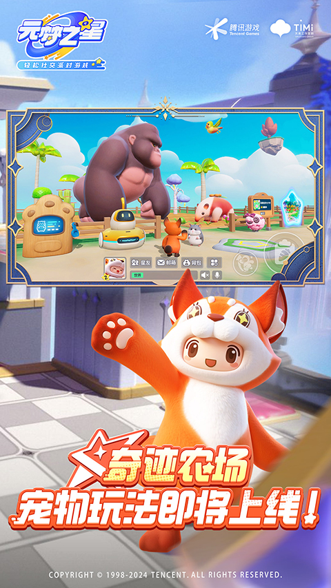 1、【变身星宝,招招手快乐通电!】 摇摇尾巴,贴贴抱抱,在乐园广场上随时和超热情星朋友笑作一团~和他们一起搭乘旋转木马、跳进泳池轰趴、登上绕场的热气球…… 2、【惊喜开团,放肆胡闹皮一下!】 这里是个无限大的游乐场,海陆空设施应有尽有:夏日丝滑水道、神奇巨石迷阵、错综复杂的空中管道……去放肆胡闹闯关!把队友抛抛抛抛~抛出去,冲向快乐终点!或者用默契一起解决谜题,逃出生天……还要小心各种机关和对手扔的香蕉皮! 3、【爆笑混战,软萌萌激烈对决!】 或者,和软萌的星宝们,来一场激烈对决!上一秒在丛林biubiu射击,下一秒在擂台欢快乱斗,但千万别被其他星宝摇头晃脑的样子欺骗了,你随时会被他们用连环头槌淘汰! 4、【无限造梦,用创意点亮宇宙!】 特特特特别重要的一件事!如果你有更多关于“开星”的脑洞,乐园神秘组织等待你的加入——DIY你的星世界地图,让全世界的星宝沉浸在你的美梦中吧!元梦之星玩法介绍